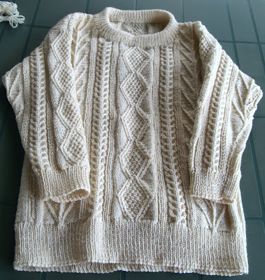 It was knitted in Bendigo Rustic [colour Aran!] 8ply and I used a little over three 200g balls. It was started on Wednesday 21st April but some days no knitting was done - days when I just couldn't face the cable needle again. There are a lot of cables in that jumper, believe me! Two trees of life on the front and back plus two on each sleeve.